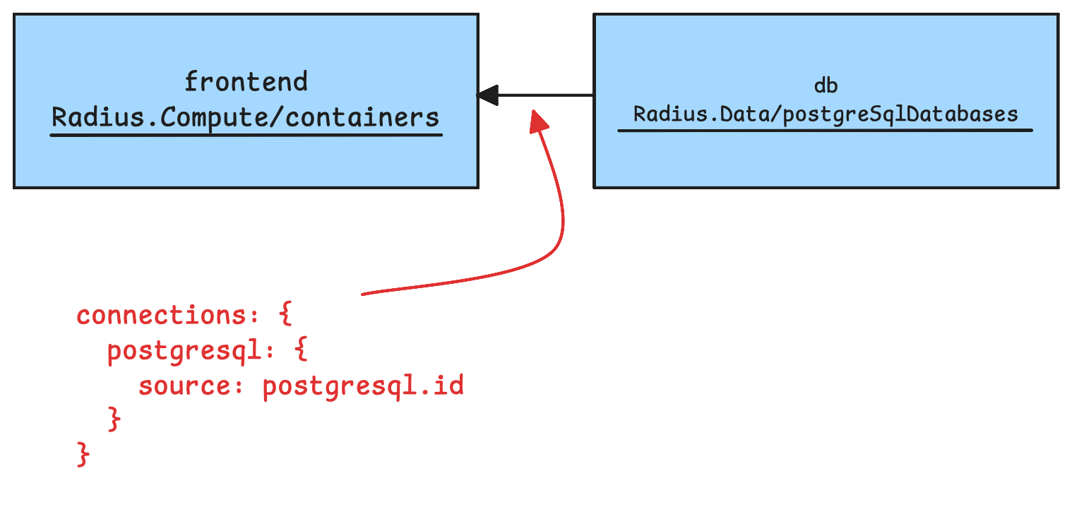 Radius builds the application graph dynamically based on the resources that get deployed. A connection is a method of manually adding an edge to the graph to explicitly express a relationship between two resources. Connecting two resources has several effects: