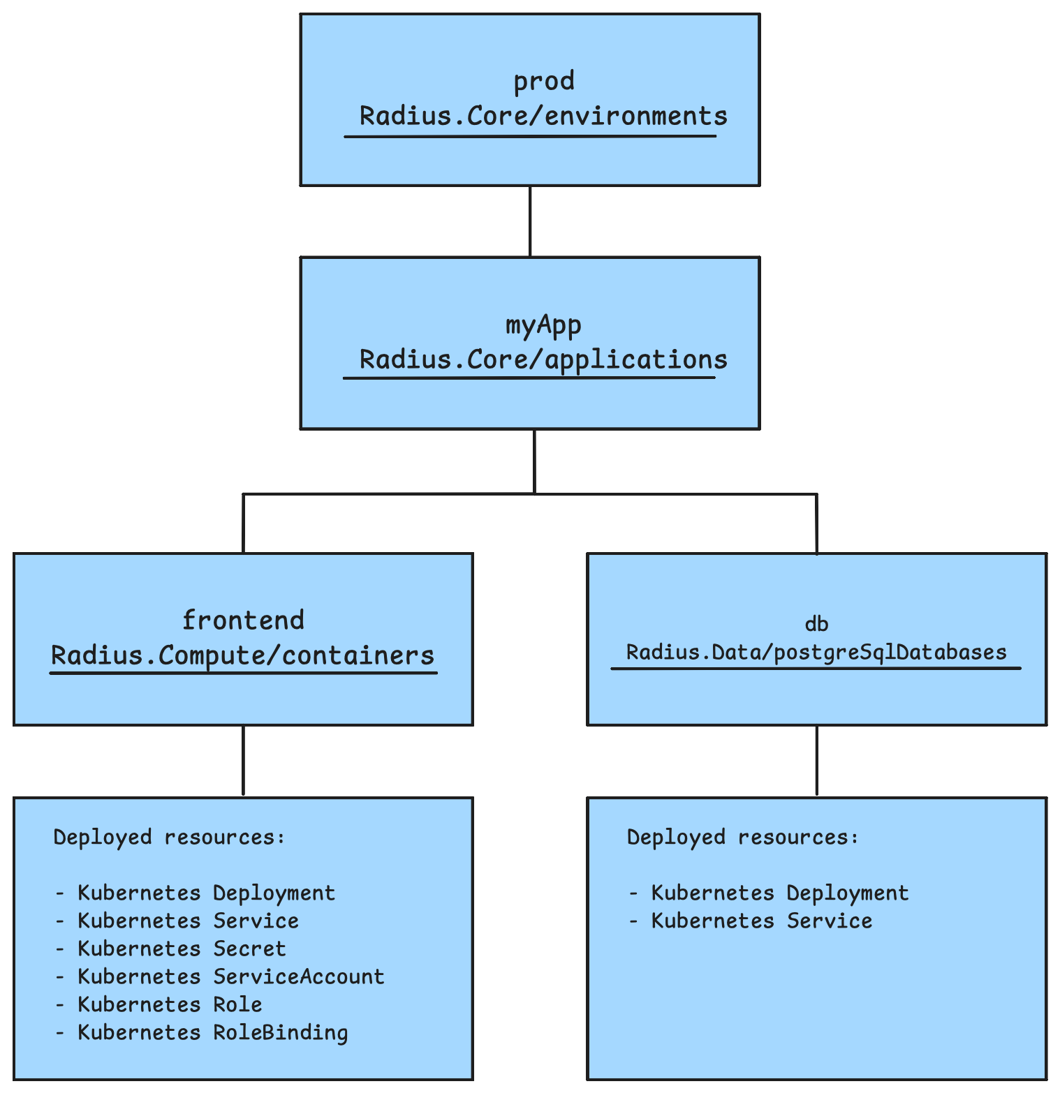 A Radius Application is a resource that is a parent to other resources that make up the application. Applications and its resources are defined in an application definition file using the Bicep Infrastructure as Code (IaC) language. Since applications are a first-class Resource Type in Radius, developers perform operations on applications rather than individual resources. When deploying resources, developers simply deploy the Application. Radius also tracks all deployed resources and their dependencies in a graph. Developers can add to the graph by expressing explicit dependencies such as a container relying on a database.